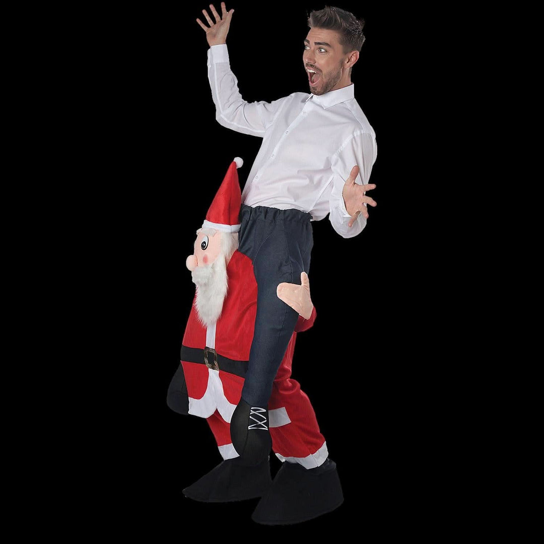 Carry Me Santa Adult CostumeSimple pants with elastic and drawstring waist give the great illusion of the wearer riding on Santa's back! Great for the Holidays! Just stuff the legs with plastic bags or polyfill through the zipper installed in the false legs. Also stuff the arms of the character for a very realistic look! 100% polyester. Hand wash cold, line dry. Do not use bleach, do not iron. Available Sizes: One size fits most adults White shirt and Santa hat are not included.