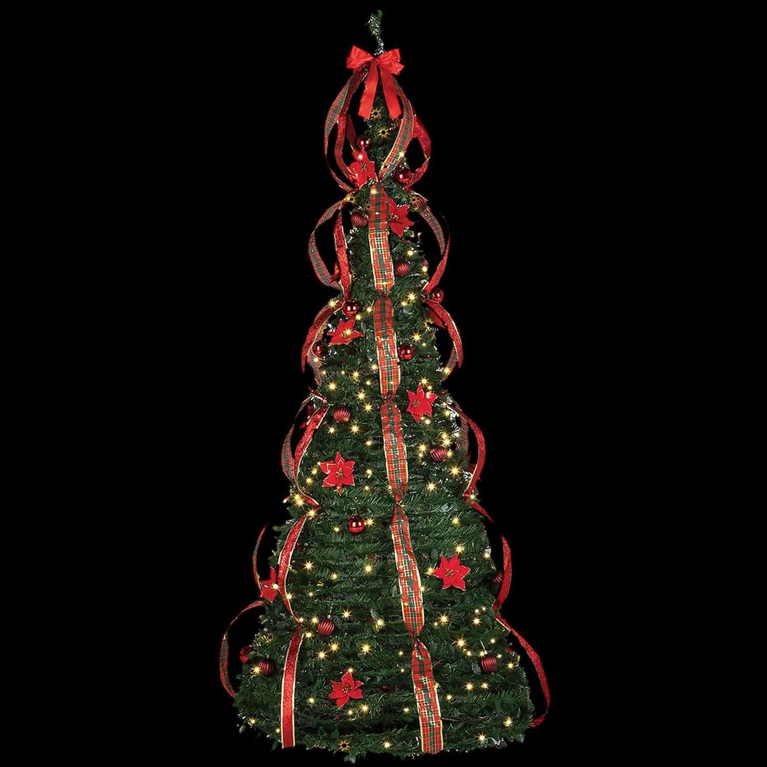 This magnificent tree comes pre-lit, pre-decorated, and sets up in minutes. Simply remove from the box, assemble the stand, and attach the tree and guide down. This 7.5-ft tree comes with 300 classic white LED lights with 8 lighting effects. Pre-decorated with red and gold ribbon, ornaments, and poinsettias, SimpliciTree™ makes holiday decorating a snap. SimpliciTree™: EASIEST. SETUP. EVER.