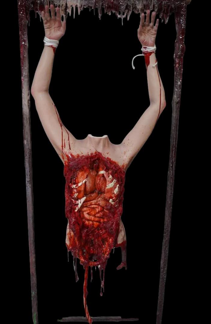 The Autopsy Agatha Photo Op Halloween Prop features a female torso with exposed organs, allowing an actor or guest to use their own head in the place of the removed one. This prop adds a realistic touch to any Halloween setting.