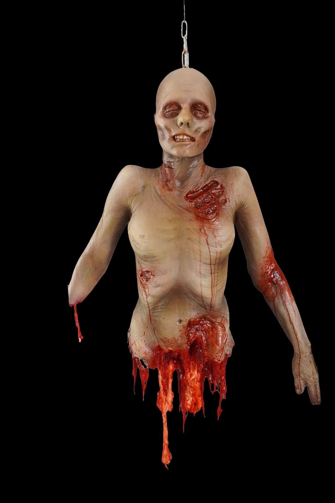 This Hanging Luttra Meat Halloween Prop features a lifesize female zombie or cadaver torso, specially reinforced for hanging by an embedded chain.