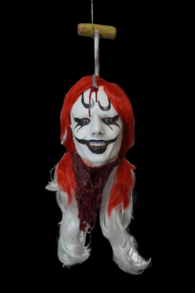 The Juggaletty Severed Head Clown Dangler is a lifelike representation of a creepy clown's head, made with durable polyfoam rubber and featuring a rubber hook for effortless hanging. Its realistic size makes it a perfect addition to any collection.