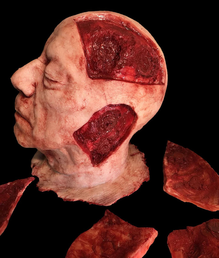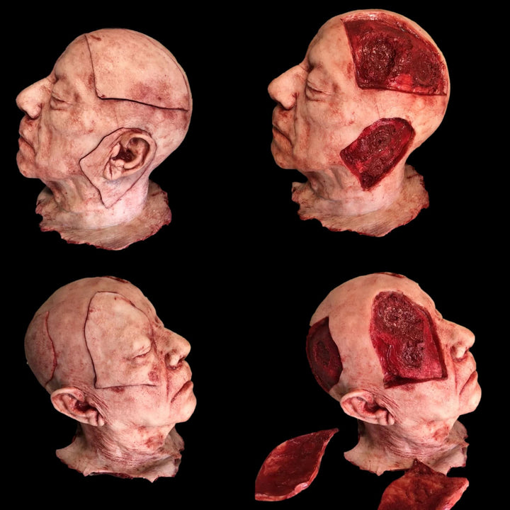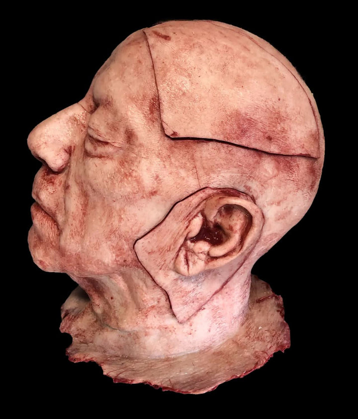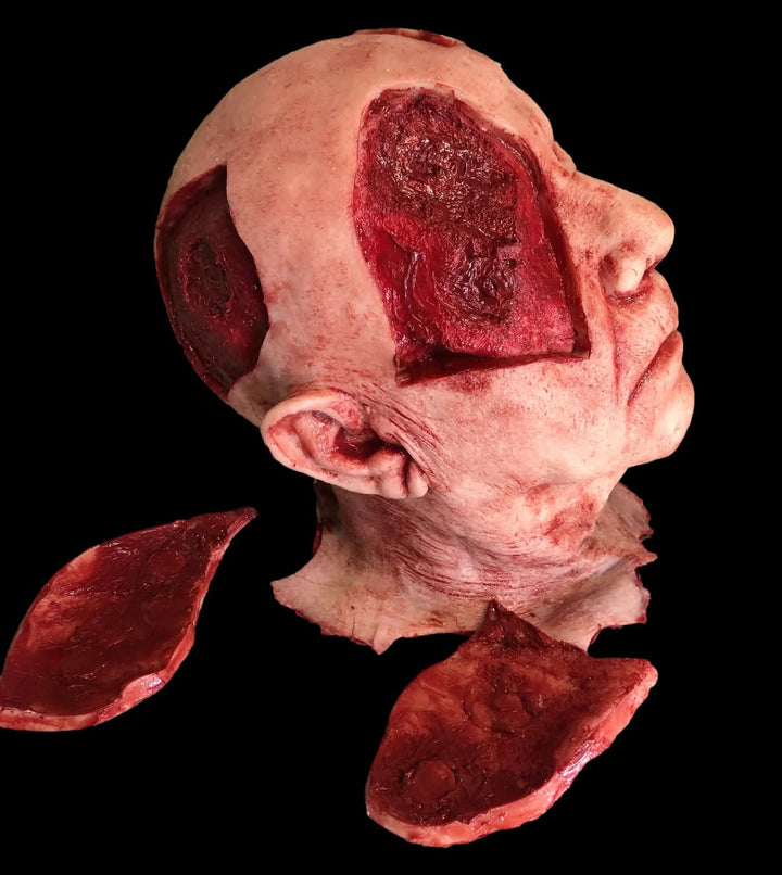 This severed head has four flaps of removable skin that are attached with strong magnets. The perfect addition to your escape room puzzles. Highly detailed and extremely durable, this piece is skinned with silicone and has a foam core. Each piece is individually made so each one is unique.