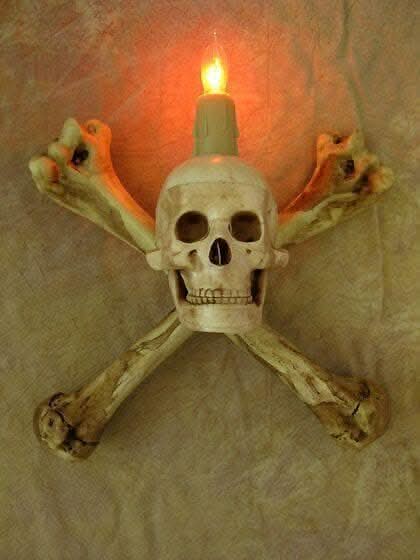 Humerus Wall Sconce- This is a smaller version of the standard life-size Skull/Crossbone sconce, made with a 3" Harvey Jr. skull and two humerus bones would help enhance that dark corner or hallway. It easily hangs on any wall. Mini-skull has flicker candle on top of the skull cap and just plugs in to a standard electrical socket; the flicker bulb is included!