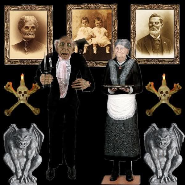 Animated Butler Greater- Spooky Animated Butler is a great addition to your haunted scene, or as a greeter when guests enter your haunted gathering! 68-inch tall figure has a friendly raven perched on his shoulder who speaks, flaps, and has light-up eyes. In addition, the candelabra he is holding lights up, and he has a palsied, shaking head movement while speaking to add to the spooky effect. Simple assembly-see our set-up video!