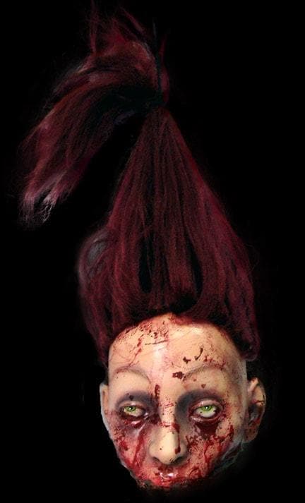 Young and carefree not too long ago, this red-headed maiden crossed the wrong person. Executed by the misplaced blade of a drunken hitman, her half hangs as a warning for all those who practice betrayal and grift. Whether she got her just deserts, or was the victim of a jealous queen's rage, we'll never quite know. She hangs from he long ginger locks in eternal silence. Dead women it seems, tell no tales. The Half-Gone Severed Head Halloween decoration will compete your haunted house's hall of horrors. This Hollywood-quality prop was crafted and hand painted by expert artists for a shockingly realistic look. You almost expect this decapitated mug to come shrieking back to life. A Horror Dome original, she'll frighten trick or treaters who wander past your abode, and make a fabulous conversation starter at the next costume party. Tie her hair to your porch's overhang and watch her dead eyes gently drift in the crisp autumn breeze.