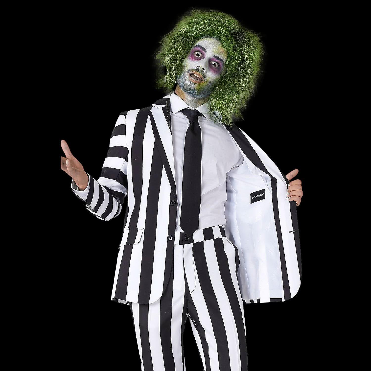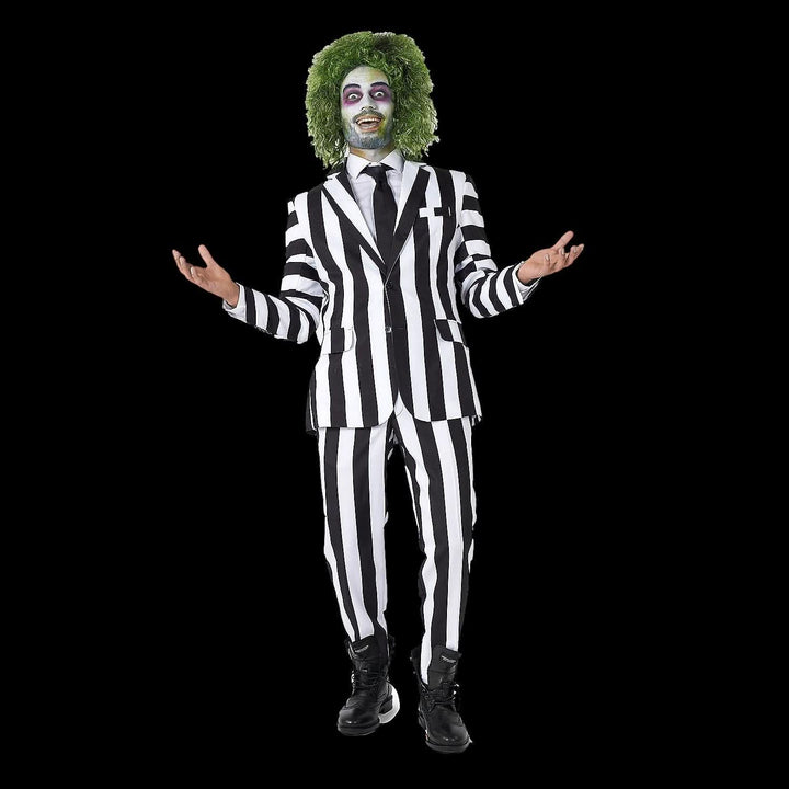 Enter the world of the supernatural with this awesome Beetlejuice suit! You can look just like everyone's favorite malicious spirit, Beetlejuice! Our Men's Beetlejuice Suit includes a black and white striped jacket with matching pants and tie. The jacket:has a 2-button front, 4 inside pockets, 4-button cuff, double vented back, front flap pockets, is fully lined, left chest pocket, notch lapels, padded shoulders, in a regular length. The pants have 2 back button-through pockets, 2 side pockets, belt loops, extra fabric in waistband and seams for tailoring, and a zip fly with hook and button closure at the waist. Inspired by the iconic film from the 80’s, this striking suit is a bold choice for any occasion! Modern slim fit design. Made of 100% high quality polyester twill fabric. Machine wash cold, do not bleach. Hang to dry. Do not tumble dry. Iron at low temperature. BEETLEJUICE is a trademark of Warner Bros. Entertainment Inc.