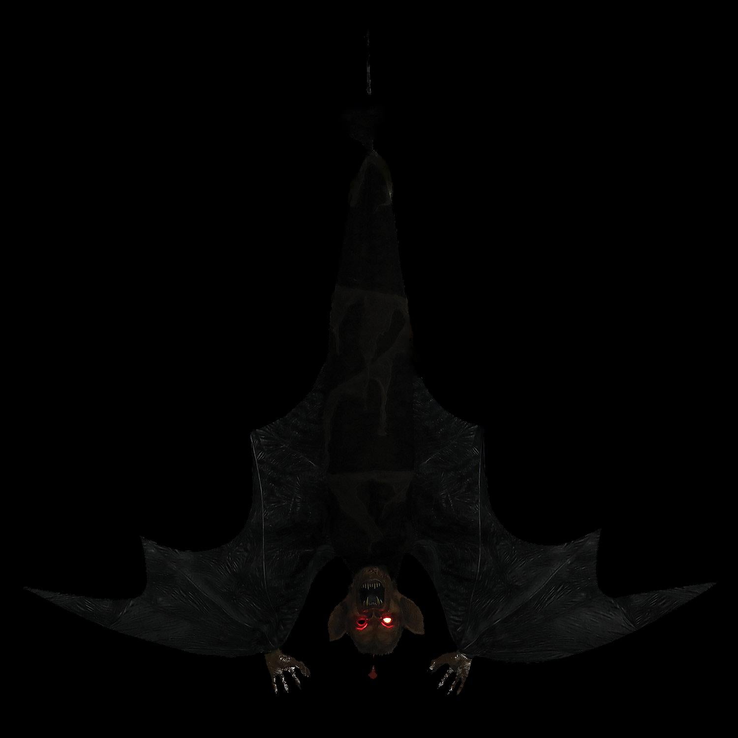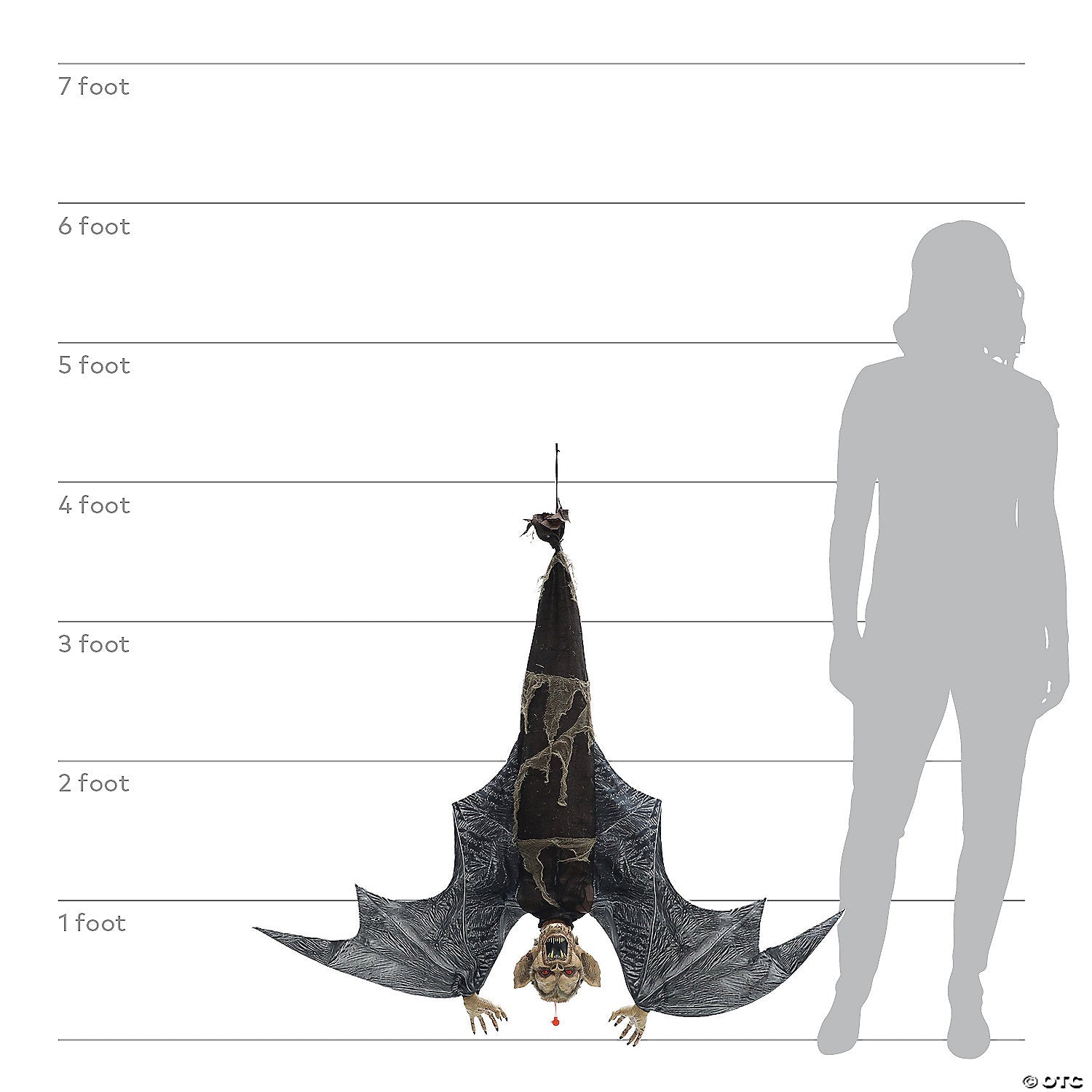 46" Menacing Hanging Bat Prop makes grating schrieking noises while his head with glowing red LED eyes turns side to side looking for his next victim! Wings move gently back and forth as he sways in the breeze. Requires 3 AA batteries, not included. Hangs easily anywhere you want to add a scary accent!