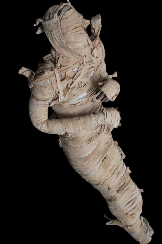 This professional full body Halloween prop, "Bandage Mummy", is a realistic depiction of an Egyptian mummy, featuring complete wrappings, a lifecast head, and a poseable mannequin body.