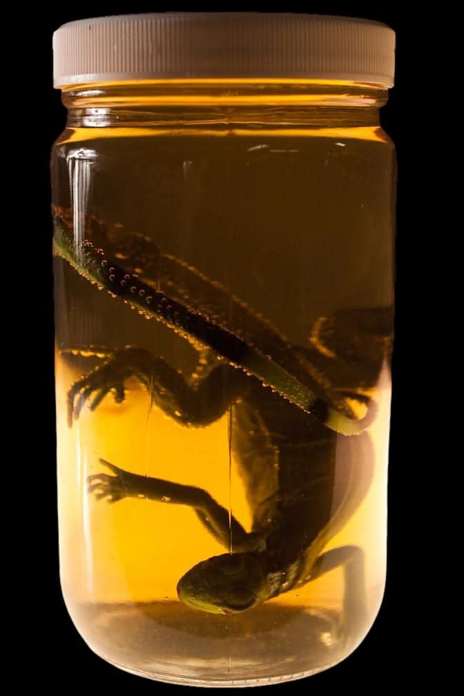 Introducing the Small Iguana Replica Specimen Jar for Halloween, packaged in a 32 oz. plastic container.