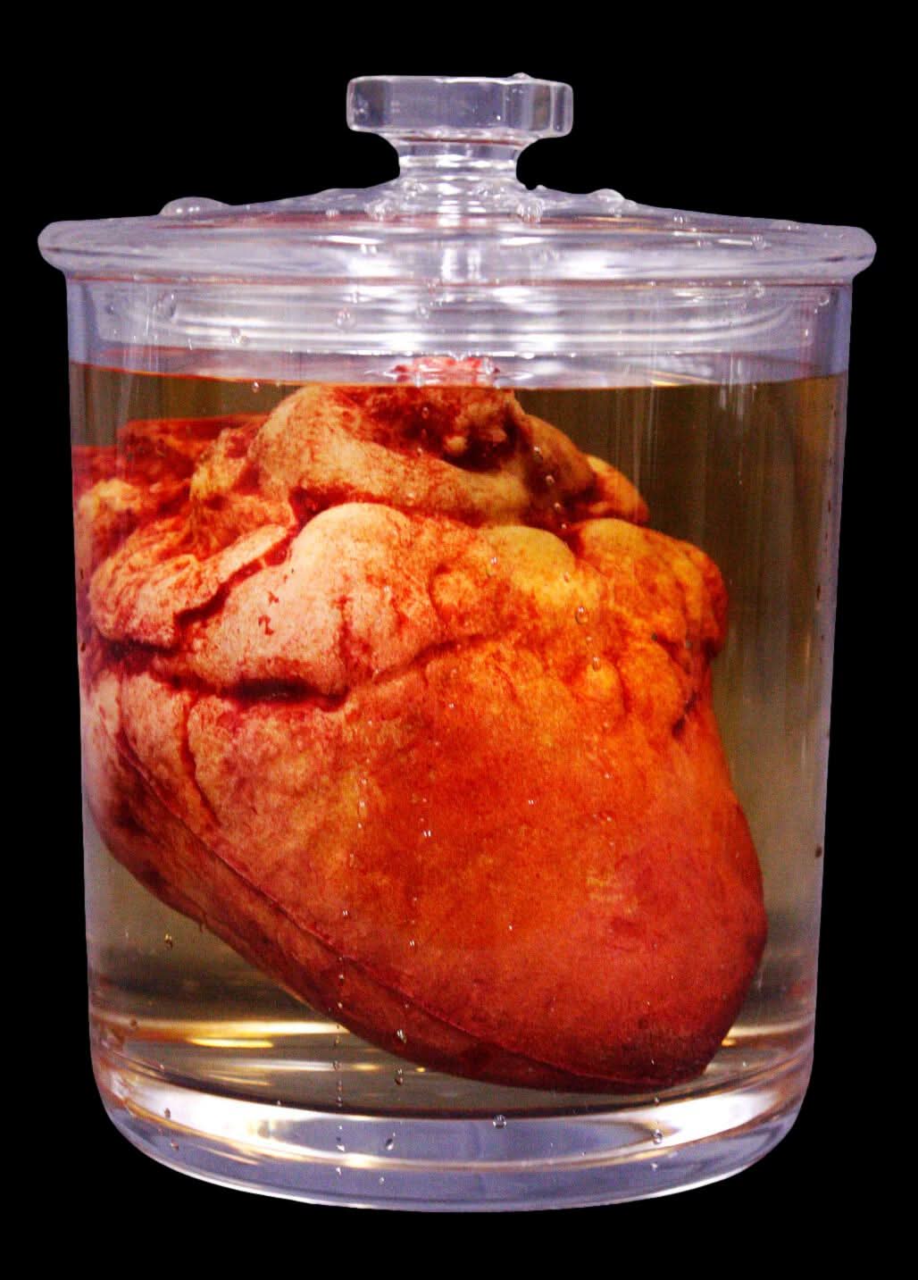 Expertly crafted from durable, hollow urethane rubber, this small lifelike heart is encased in a shatterproof acrylic apothecary jar.