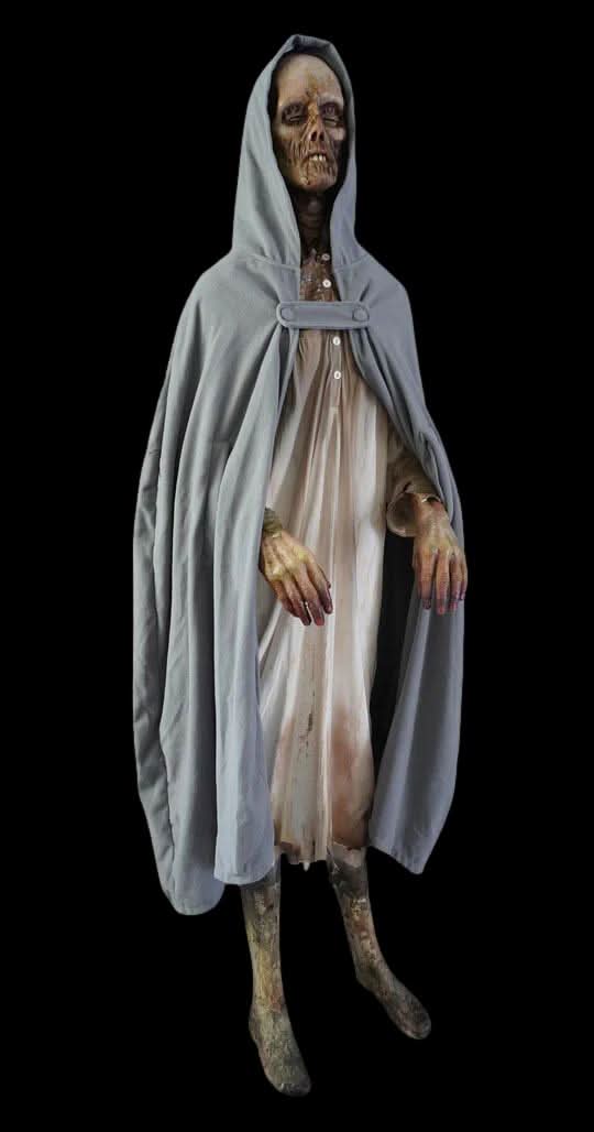This "Nell Cursed Witch" Professional Halloween Prop offers a lifesize standing figure of a decaying witch, complete with a sunken face and nose, to create a chillingly realistic effect. The poseable mannequin body allows for flexible display, while the sculpted head and hands, along with the included removeable lightweight stand, add value and convenience to this prop. Measuring at 5'7, this professional prop is perfect for adding an extra touch of horror to your Halloween decor.
