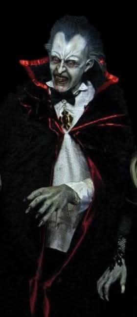 The Count haunted house statue from The Horror Dome will make a freaky and frightening addition to any professional haunted house attraction. Hand crafted, detailed and painted, this semi-posable statue is incredibly lifelike. Standing at 6' tall, he's an imposing sight, especially when accenting with motion triggered lights and fog. The Count has a menacing expression, pale grey skin, and blood from a fresh kill dripping off his lips. He wears a white dress shirt and bow tie, under a black cloak with red trim. He's an iconic vampire design that feels eerily familiar and completely disturbing. Set an unforgettable scene, or attract customers to your business around Halloween, with this fantastically ferocious statue.