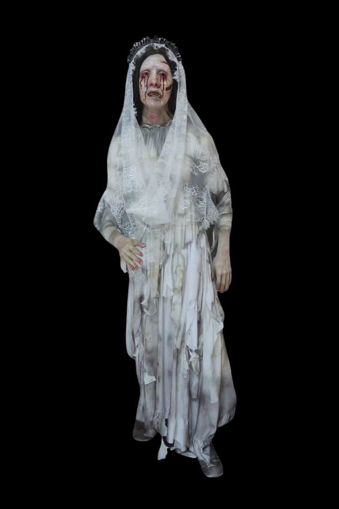Free standing Lenore Zombie Character comes complete with poseable arms, upper torso rotates in a creepy zombie like movement. Includes clothes, styled character, stand and motor. Almost 6 feet tall. Electric Prop. Add Sound System for an additional $125.00.
