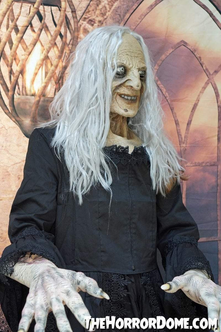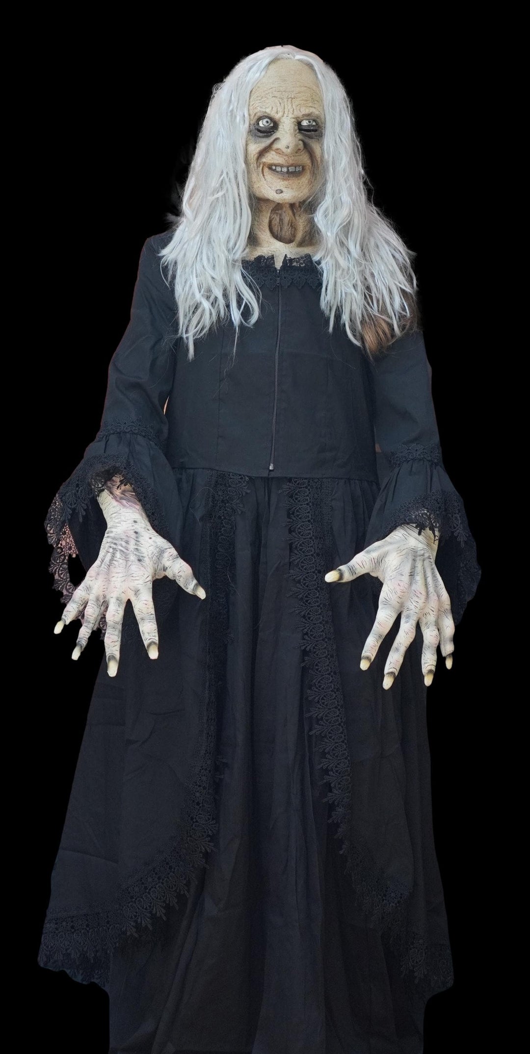 This wicked witch comes with everything you see. Witchy Woman mask, a professional dress that is movie-quality with high-quality fabric, and latex gloves.