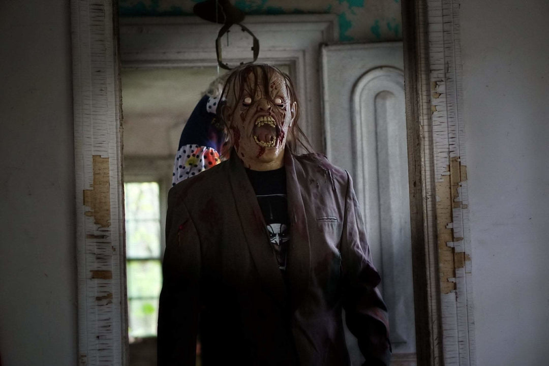 The Horror Dome's Dead Awake mask worn with tattered clothing for seamless horror