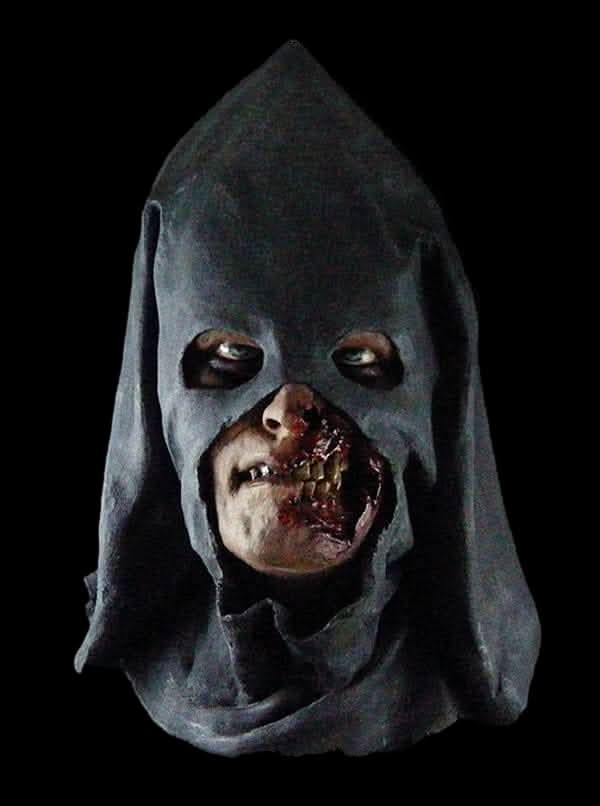 The Zombie Executioner Halloween mask is an original Horror Dome creation. With a gnarly, torn-up face mysteriously hidden under a black hood, he carries out interrogations, torture, and executions without a shred of remorse. Hand painted for a bone-chillingly lifelike look, this unique over the head design will make a stunning costume when worn with a black cloak, trench coat, or long sleeve tee. Reminding your guests to behave, or else The Henchman will send them to their grave.