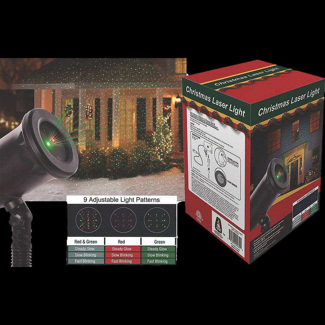 Decorate your house and landscape with the Christmas Laser Light Projector everyone is talking about! Simply plug in the included UL Power adapter into any standard outlet and watch everything be covered in dazzling lights! Nine Adjustable Light Patterns: Red/Green Red and Green each in steady glow slow blinking, fast blinking. Use the included ground stake to easily set up and display anywhere in your yard. Includes laser light with 64 inch power cord, and one stake. Control button and light sensor located on back of laser light. Project a vibrant Christmas pattern anywhere, powerful laser-lit pattern projects up to 98 feet, adjustable for easy placements in your garden, light sensor activation, auto on at night, and auto off in daylight. Laser light swivels when attached to ground stake. Input - AC 120v 60Hz 10W. Indoor/Outdoor use. This is not a toy; for decorative use only. Only point lighting toward a fixed structure; do not look directly into the light, can cause eye damage. Measurements when attached to stake - 13.5 inche 5.5 inches x 4.5 inches. Plastic.