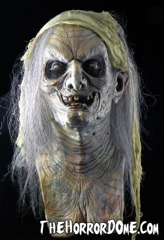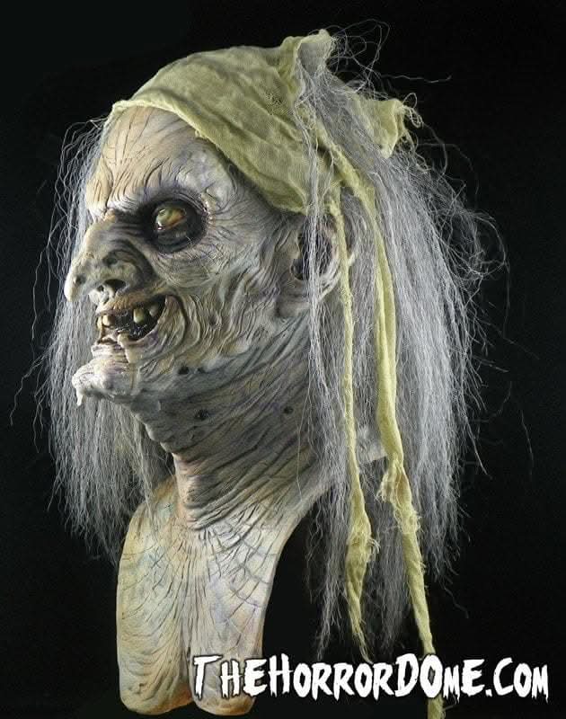 This full sized, over the head, latex Halloween mask is designed and crafted by The Horror Dome. With stringy, cobweb-like hair, leathery, decaying skin, dark sunken eyes and a mouth full of rotting teeth, Esmerelda is truly a sight to behold. A dirty headscarf and a wrinkly neck round out her disgusting look.