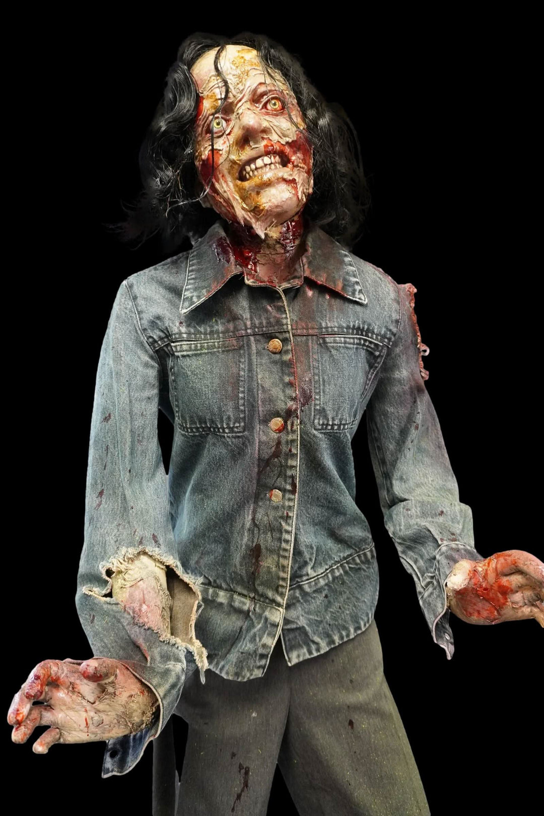 Place this scary fellow at your door and watch what happens. This Twisting Zombie will cause your visitors to shout! The Twisting Zombie moves from side to side as he turns his head and screams. His arms move with him, however they do not bend. Mr. Zombie is 12" in length, 8.75" wide and 36" tall and weighs 2.2lbs . He is constructed of latex and has a sturdy frame. He has the finest of cloths made of polyester. Twisting Zombie comes with easy to assemble directions and can be stored easily for years to come. Twisting zombie that appears to be looking for his next victim. Posable arms allow different looks.